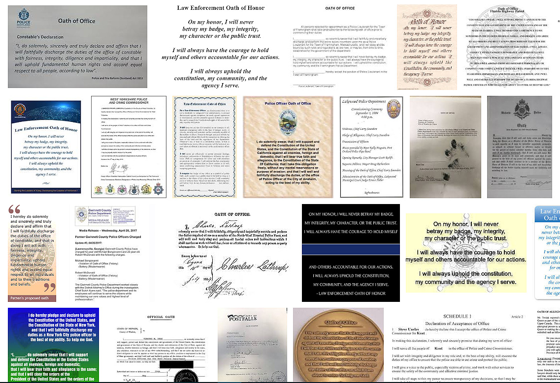 As I mentioned in a previous comment about drivers licences perhaps police officers would benefit from a fortified promise or self designed mission statement written by them after training is completed. This statement could be placed on the back of their warrant card as a reminder. This could be far more relevant to many officers than an oath of office.