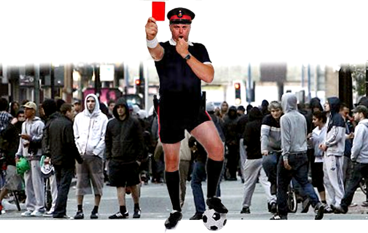 The referee stands at attention (just like a cop), showing a red card to tens of thousands of people in the stadium. He waves it around with an up stretched arm, points at the miscreant as a form of shaming before taking out his notebook (just like a cop) and writing down the name of the person who committed the grievous violation. It can get quite emotional, even triggering riots and loss of life in some quarters of the world.